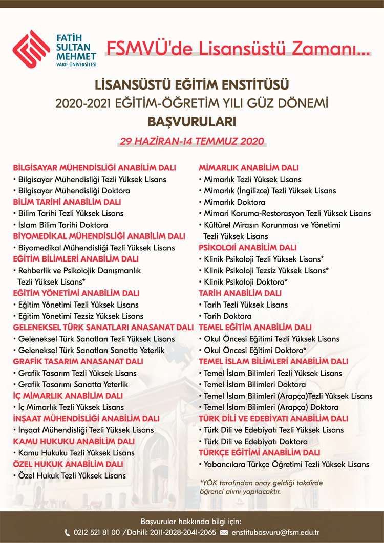 2020-2021 Eğitim-Öğretim yılı için Enstitümüzün Yüksek Lisans, Doktora ve Sanatta Yeterlik programlarına,